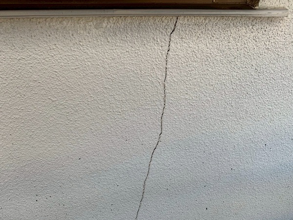 K様邸はモルタル壁の住宅で、長年の風雨や地震の影響により外壁に大きなクラック(ひび割れ)が複数箇所確認されました。