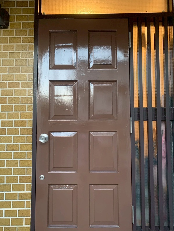 玄関ドアも同色系でリフレッシュされ、艶やかに仕上がりました。