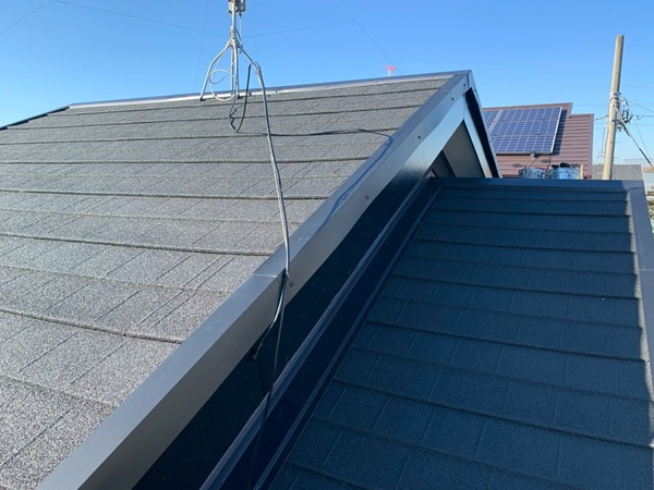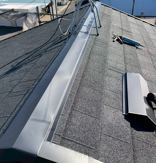 最後に棟板金・谷板金を取り付けてコーキング処理を行い、屋根カバー工法は完了です。